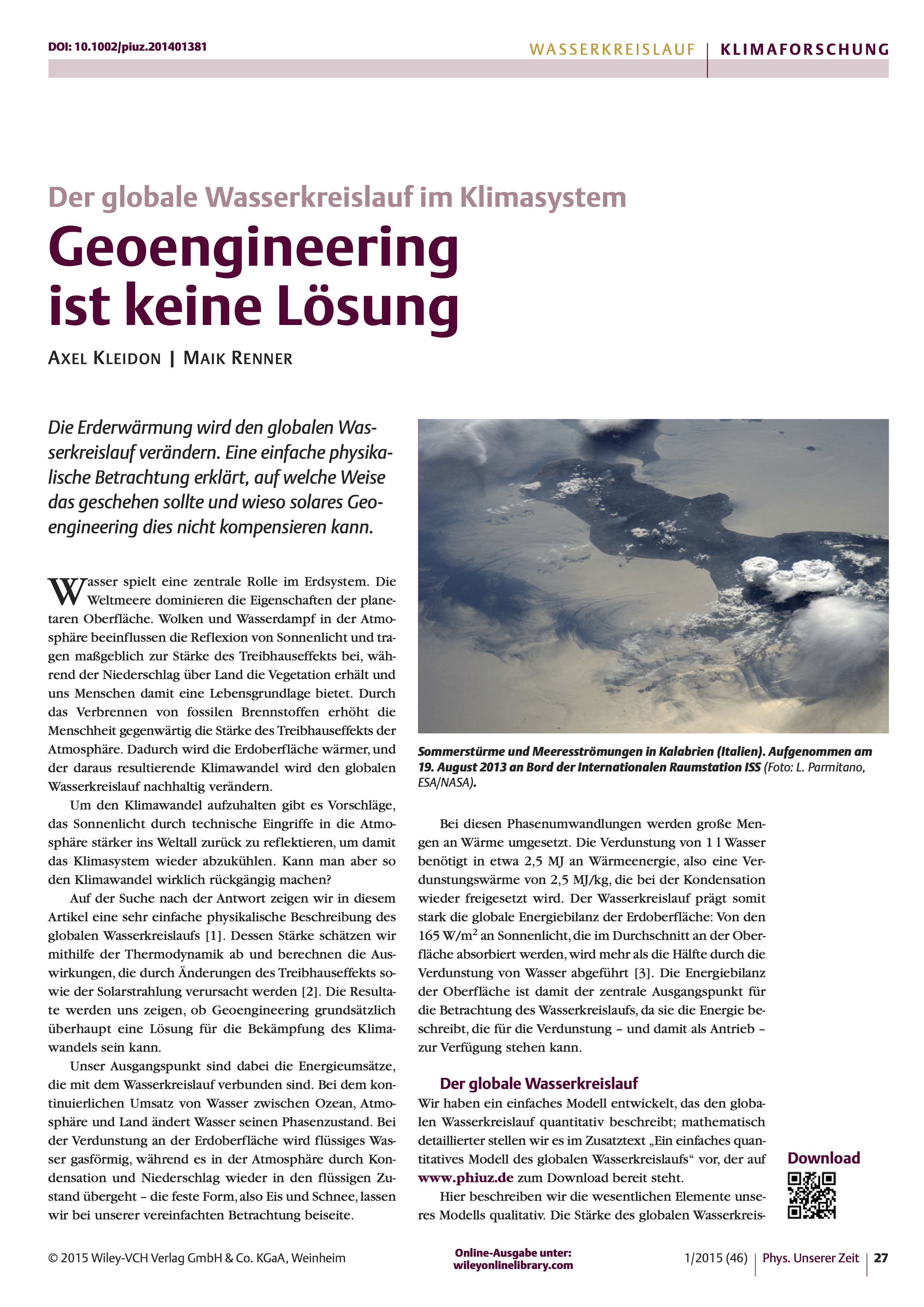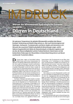 Der globale Wasserkreislauf transportiert gewaltige Mengen an Energie durch Verdunstung und anschließende Kondensation von der Erdoberfläche in die Atmosphäre. Er baut mit diesem latenten Energiefluss den planetaren Antrieb ab, in dem Sonnenlicht die Erdoberfläche erwärmt und Abstrahlung ins Weltall die Atmosphäre kühlt. Eine Betrachtung der globalen Energiebilanz zusammen mit der thermodynamischen Grenze von Luftbewegung als Wärmekraftmaschine liefert eine einfache Abschätzung, die das Verhalten von weitaus komplexeren Klimamodellen erstaunlich gut wiedergibt. Dabei zeigt sich, dass der Wasserkreislauf stärker auf eine Erwärmung durch Solarstrahlung reagiert als auf Änderungen des Treibhauseffekts. Die Konsequenz: Geoengineering kann eine globale Klimaerwärmung mitsamt ihren Folgen für den Wasserkreislauf nicht einfach rückgängig machen, indem es die Solarstrahlung verringert.