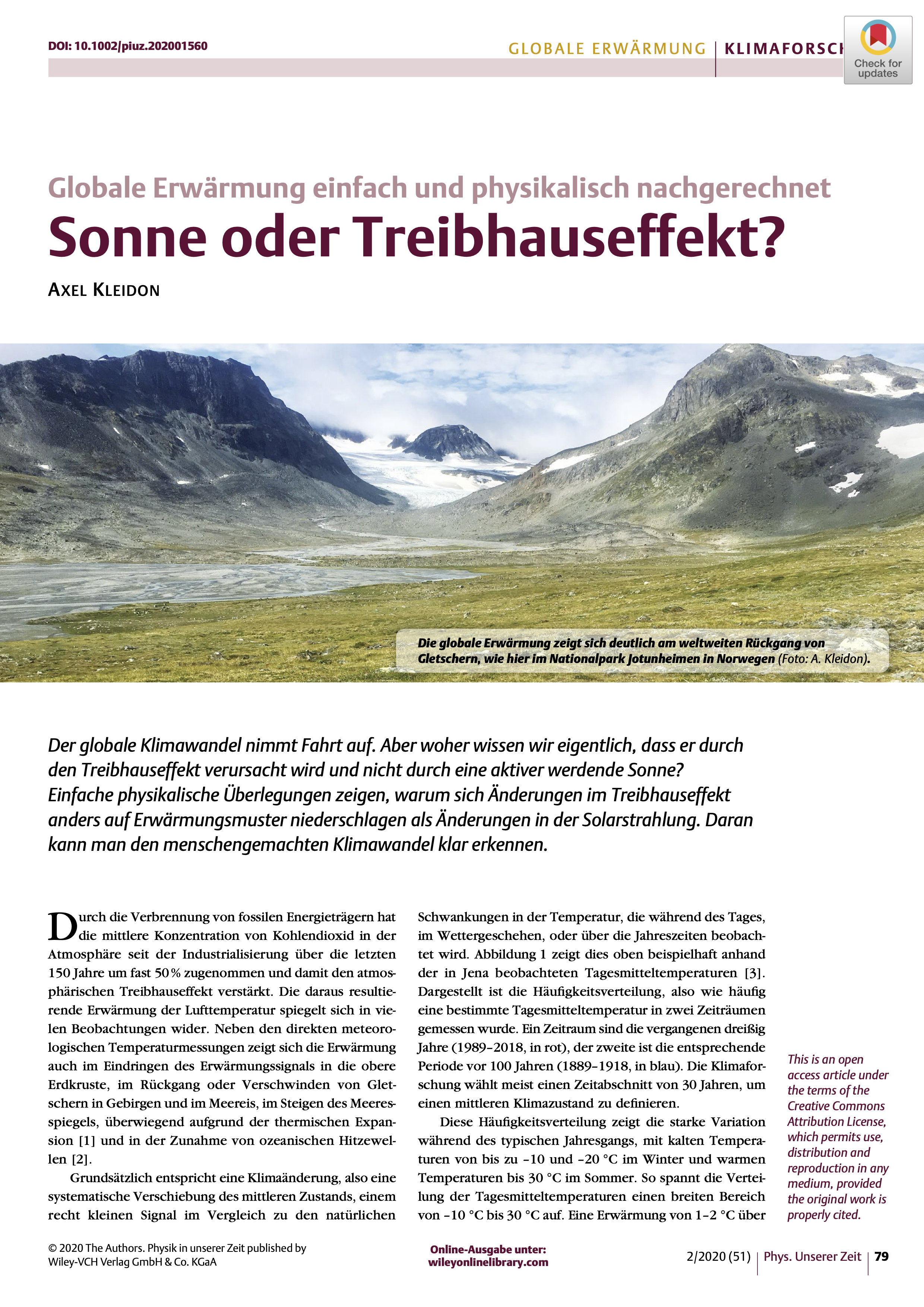 Die Verbrennung von fossilen Energieträgern hat den atmosphärischen Treibhauseffekt verstärkt, was zur Erderwärmung führt. Doch woher wissen wir, dass der Treibhauseffekt einen so entscheidenden Einfluss auf das Klima hat? Alternativ könnte auch eine ansteigende Sonnenaktivität hinter der Erwärmung stecken. Doch ein erhöhter Treibhauseffekt wirkt sich anders auf das Erdklima aus als eine verstärkte Sonneneinstrahlung. Charakteristisch für den Treibhauseffekt ist zum Beispiel, dass sich die kälteren Regionen in Richtung der Pole stärker erwärmen, obwohl sie geringerer Solarstrahlung ausgesetzt sind. Warum das so ist, lässt sich mit einer relativ einfachen Energiebilanz zeigen, die wesentlichen Terme der Erwärmung und Kühlung berücksichtigt. Dieser Artikel stellt diesen Ansatz vor und demonstriert damit, dass die Oberflächentemperatur wesentlich vom Treibhauseffekt bestimmt wird.