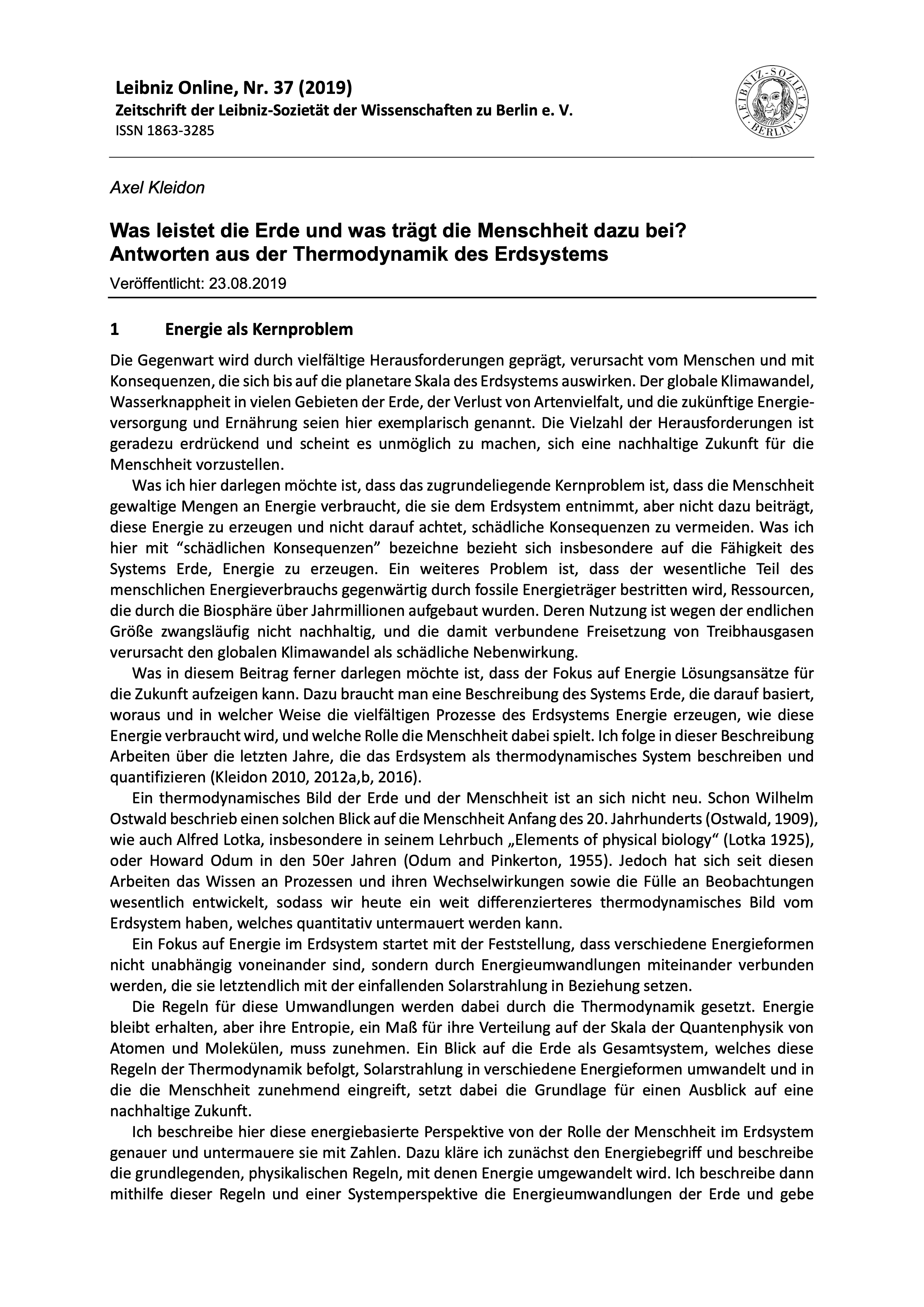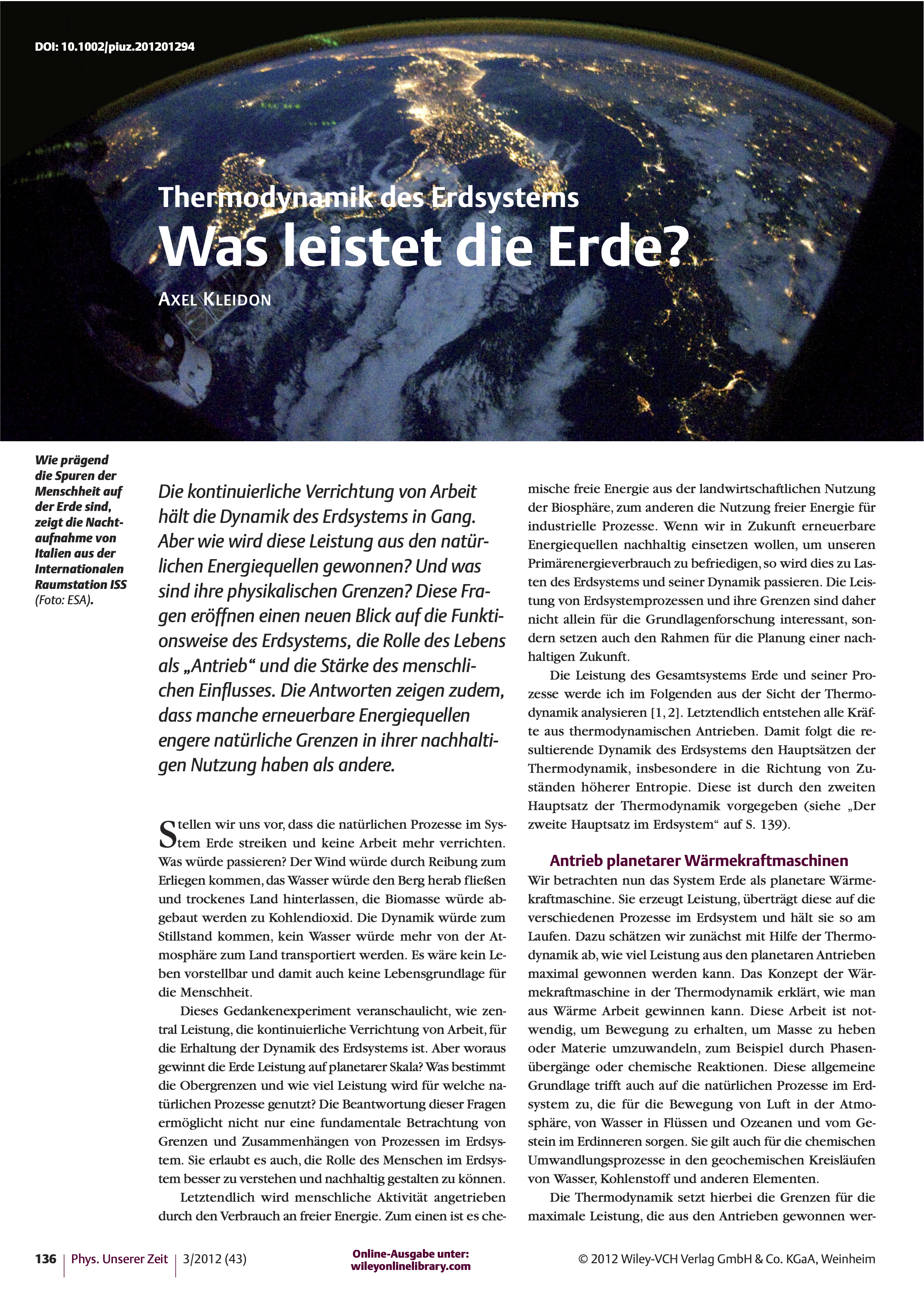 Die Erde als thermodynamisches System betrachtet arbeitet als planetare Wärmekraftmaschine. Sie erzeugt Leistung, verrichtet Arbeit und erhält damit die Dynamik. Die Grenzen beschreibt die Thermodynamik, insbesondere der zweite Hauptsatz, der die Umsetzung von Wärme zu Leistung limitiert. Diese Betrachtungsweise erschließt eine grundsätzliche Perspektive über die Zusammenhänge und Wechselwirkungen von planetaren Antrieben und Erdsystemprozessen. Sie macht deutlich, wie die physikalische Leistung im Erdsystem limitiert ist. Zudem zeigt sie, welche zentrale Bedeutung das Leben auf der Erde für die Erzeugung von chemischer freier Energie hat. Allerdings verbraucht die menschliche Aktivität bereits auf planetarer Skala erheblich an freier Energie. Eine nachhaltige Planung der Zukunft sollte darauf zielen, durch effizientere Nutzung der Solarstrahlung die Gesamtleistung des Erdsystems zu erhöhen.