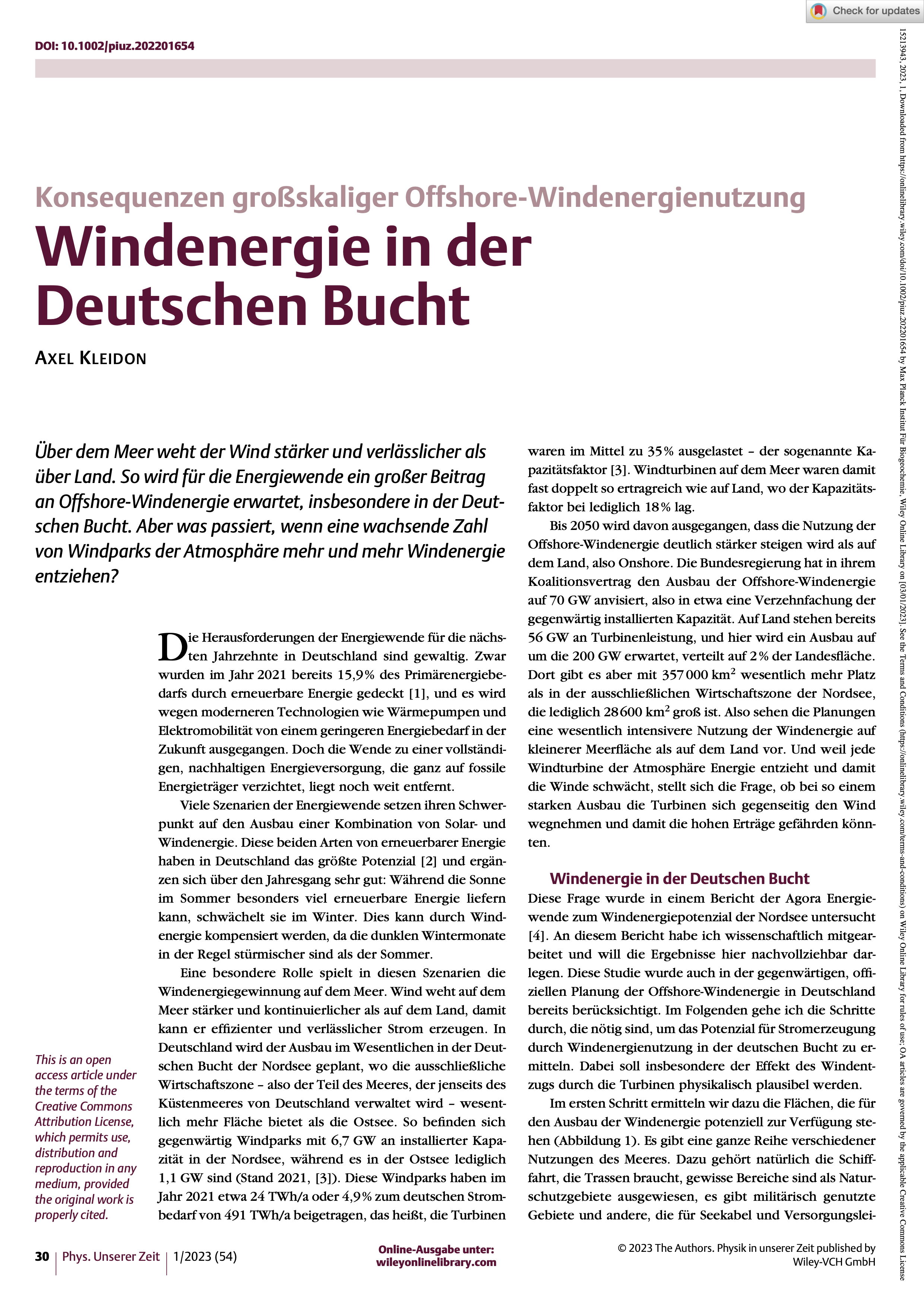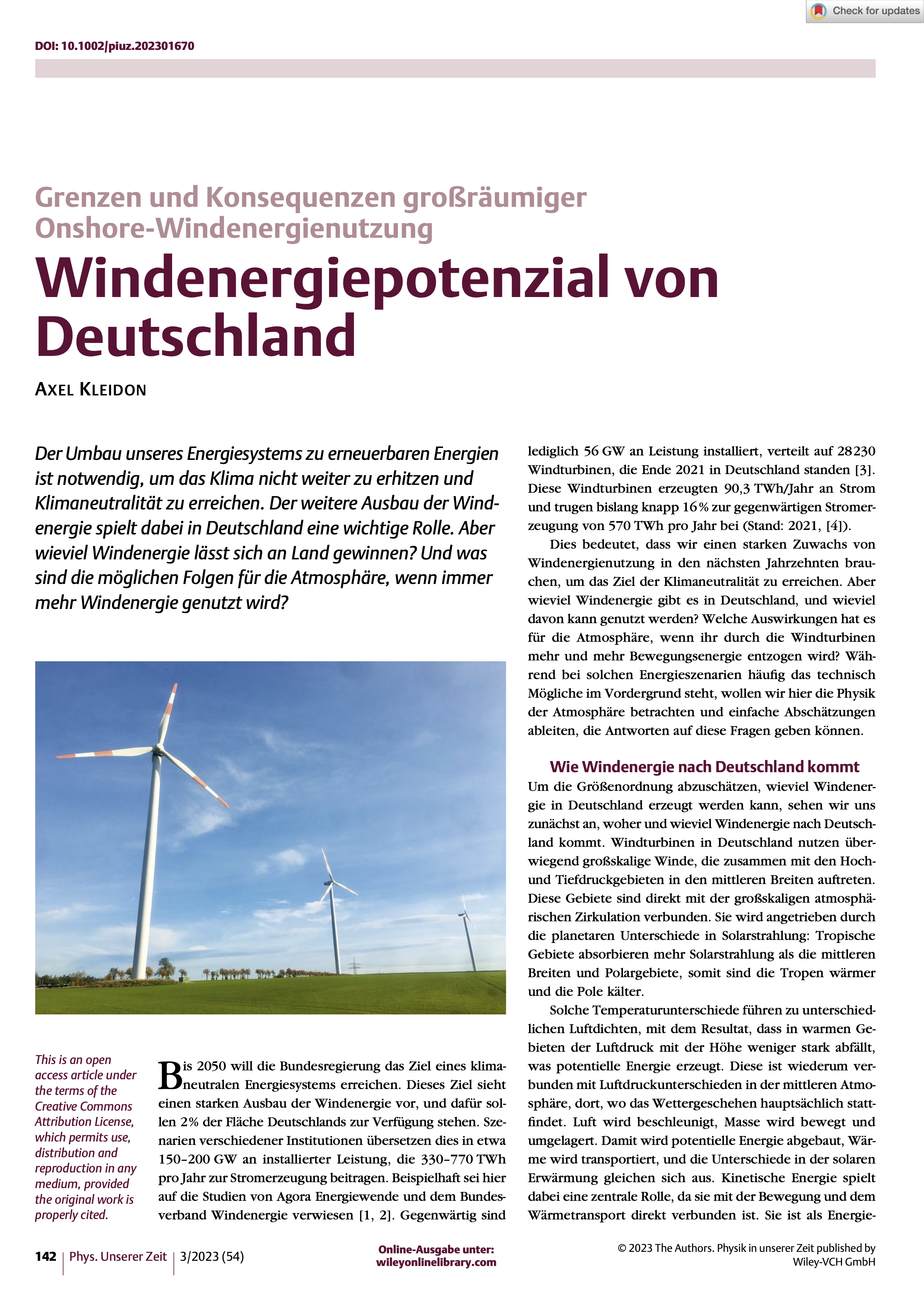 Die Windenergienutzung in Deutschland soll bis 2050 mit bis zu 200 Gigawatt ausgebaut werden, was in etwa einer Vervierfachung im Vergleich zu heute entspricht. Diese Windturbinen werden der Atmosphäre dabei Windenergie entziehen und damit die Atmosphäre beeinflussen. Dies wirkt sich auf die Effizienz der Windenergienutzung aus, weil die Windgeschwindigkeiten in den betroffenen Regionen sinken müssen. Mithilfe der Impulsbilanz und den damit verbundenen kinetischen Energieflüssen lässt sich abschätzen, dass deshalb der Stromertrag um etwa 10 bis 15 % sinkt. Der Effekt ist geringer, wenn die Windturbinen gleichmäßiger über mehr Fläche verteilt sind. Trotz dieser Effekte lässt sich mit der Windenergie sehr viel Strom erzeugen, die betrachteten Szenarien würden mehr als die Hälfte des gegenwärtigen Strombedarfs damit decken. Die Auswirkungen auf die Atmosphäre sind dabei sehr gering. Die umgesetzte Windenergie beträgt lediglich 2,4 % des Verlusts an kinetischer Energie, die ohnehin auf natürliche Weise durch Reibung in der unteren Atmosphäre verloren geht.