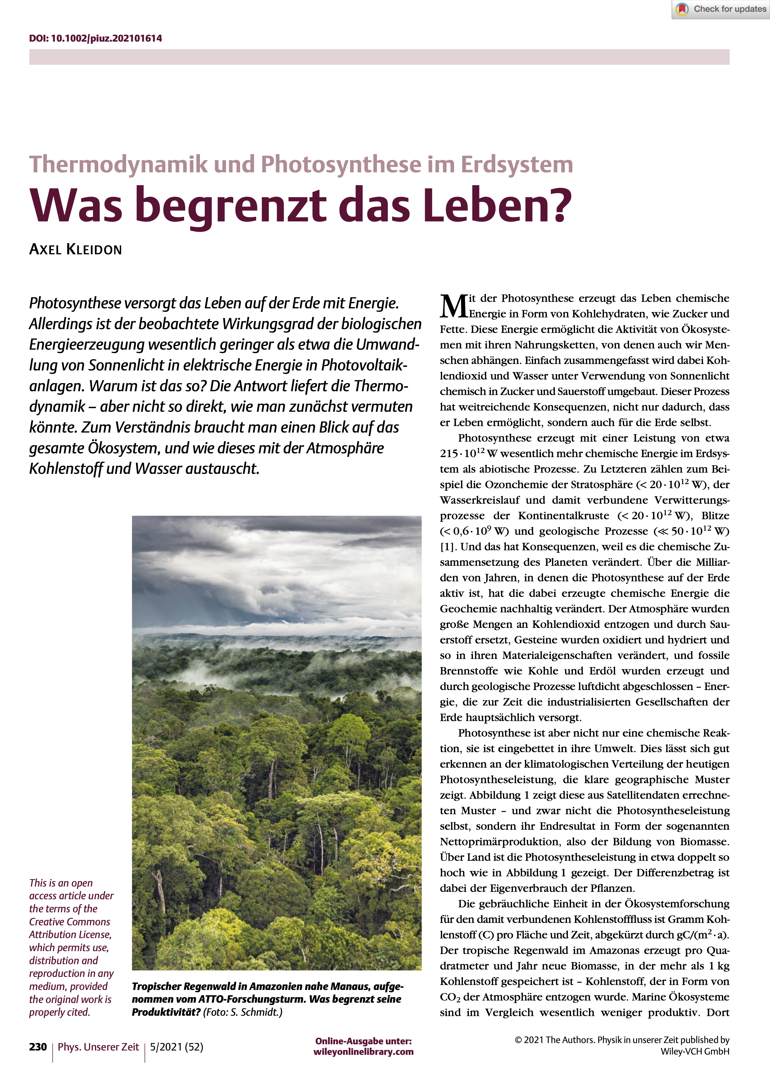 Seit langer Zeit ist gut dokumentiert, dass die Photosynthese mit einem sehr geringen Wirkungsgrad von weniger als 3 % aus Sonnenlicht chemische Energie gewinnt. Aber warum ist der Prozess so ineffizient? Schließlich hatte die Photosynthese mehr als drei Milliarden Jahre in der Erdgeschichte Zeit, sich zu optimieren. Diese Frage wird hier mit dem geringen, aber thermodynamisch limitierten Gasaustausch zwischen Pflanzen und Atmosphäre erklärt. Während des Tages müssen Pflanzen der Atmosphäre Kohlendioxid entziehen, den Rohstoff für die Photosynthese. Dabei verlieren sie unvermeidbar große Mengen an Wasserdampf, verbunden mit ihrer Transpiration. Folglich sind Kohlendioxidaufnahme und Wasserdampfabgabe eng miteinander verbunden. Eine einfache Abschätzung zeigt, dass dieser Massenaustausch zwischen Erdoberfläche und Atmosphäre thermodynamisch limitiert ist. Sie kann die geringe Effizienz der Photosynthese schlüssig erklären.