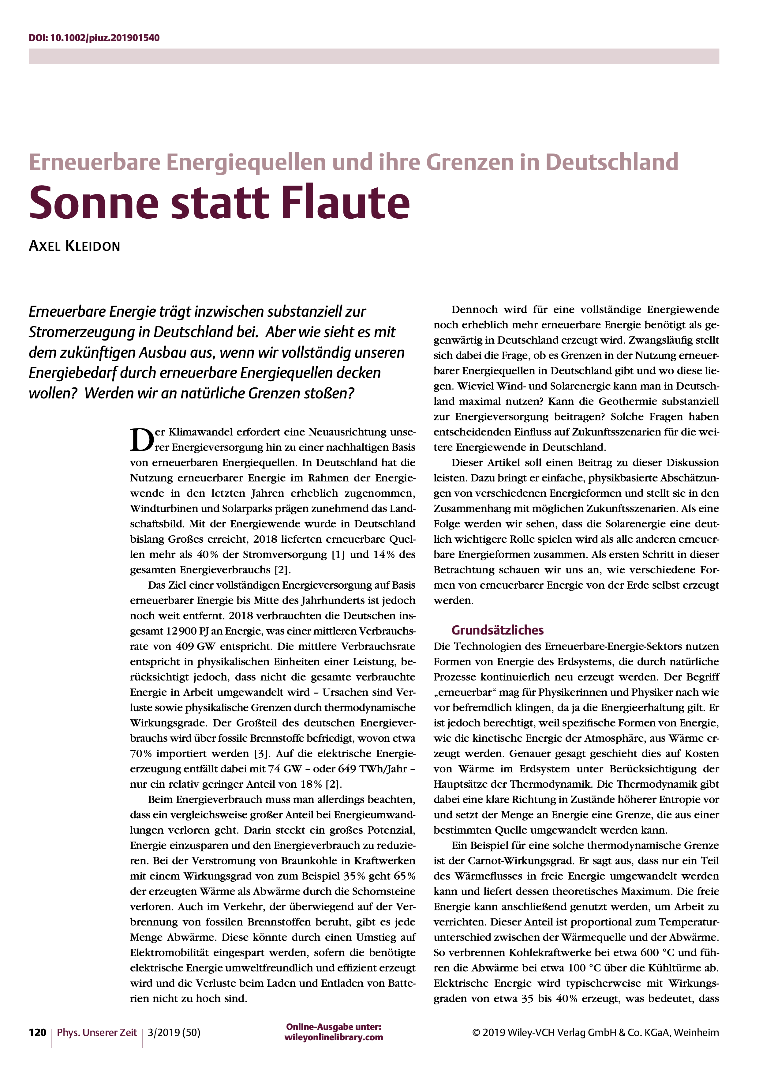 Die Energiewende hat zum Ziel, den Energiebedarf Deutschlands komplett aus erneuerbaren Energiequellen zu decken. Ist das innerhalb des Landes möglich? Im Prinzip ja, zeigen Abschätzungen. Der Schlüssel ist die direkte Nutzung der Solarenergie, denn sie liefert mehr als genug erneuerbare Energie. Erneuerbare Energiequellen wie Wind, Wasserkraft oder Biomasse entstehen aus der Solarstrahlung über Umwandlungsketten mit oft geringen Wirkungsgraden. Ihre Potenziale sind entsprechend niedriger, besonders ineffizient ist die Biomasse. Auch der große Beitrag des Winds in derzeitigen Zukunftsszenarien der Energiewende ist kritisch zu bewerten. Die Nutzungsgrenzen der Windenergie werden wahrscheinlich bereits innerhalb dieser Szenarien überschritten. Da Solarenergie aber jahreszeitlich stark schwankt, sind effiziente Energiespeicher oder der Schritt über die Grenzen Deutschlands hinaus notwendig. Dann gelingt die Wende zu 100% erneuerbarer Energie.